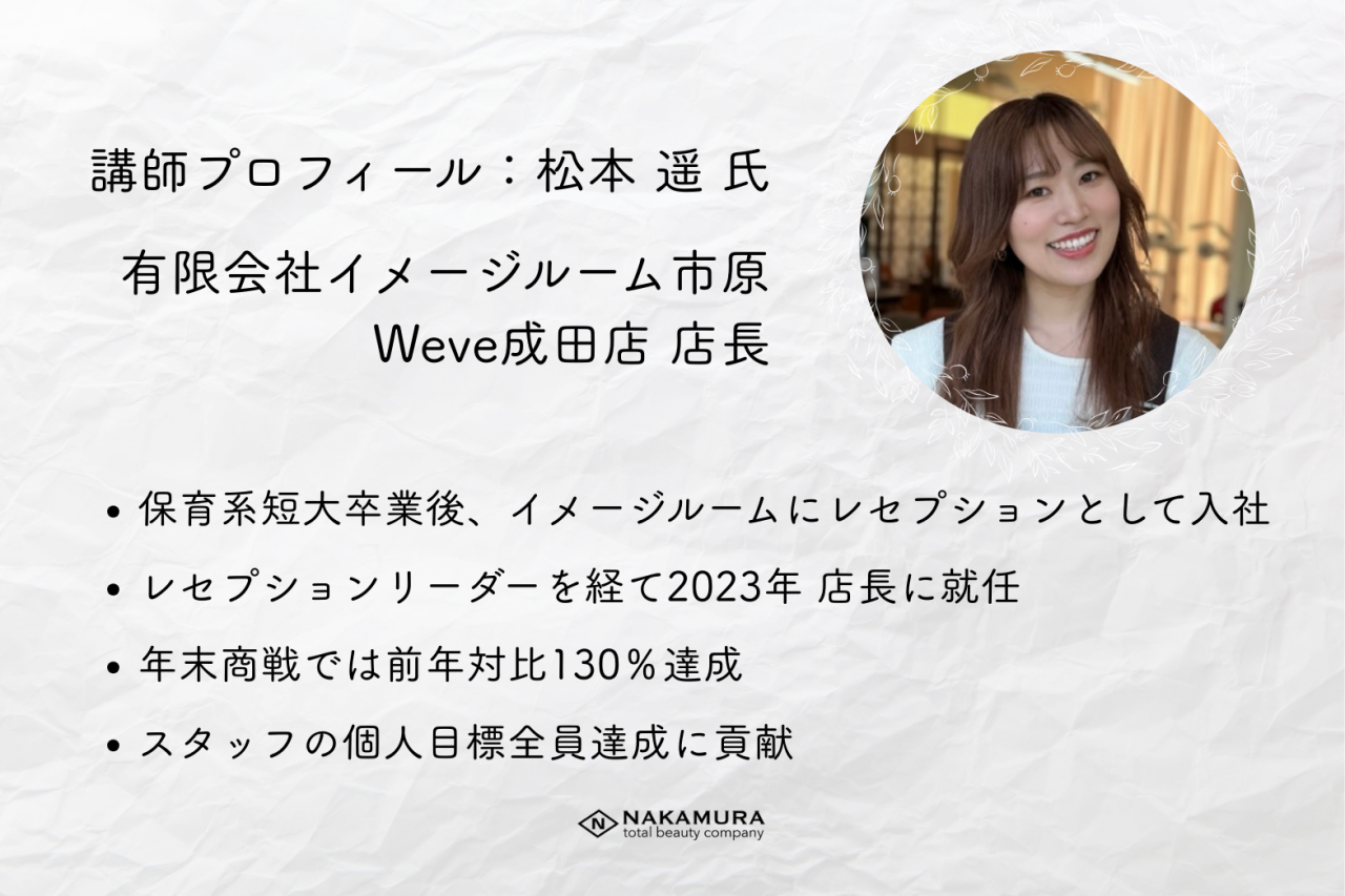今回開催される「チームワークセミナー」では、実際に現場で数々の挑戦と失敗を重ねながら、自分らしいチームづくりを実践してきたWeve成田店 店長 松本 遥 氏をお迎えし、今求められるリーダーの在り方を、リアルな視点でお届けします。